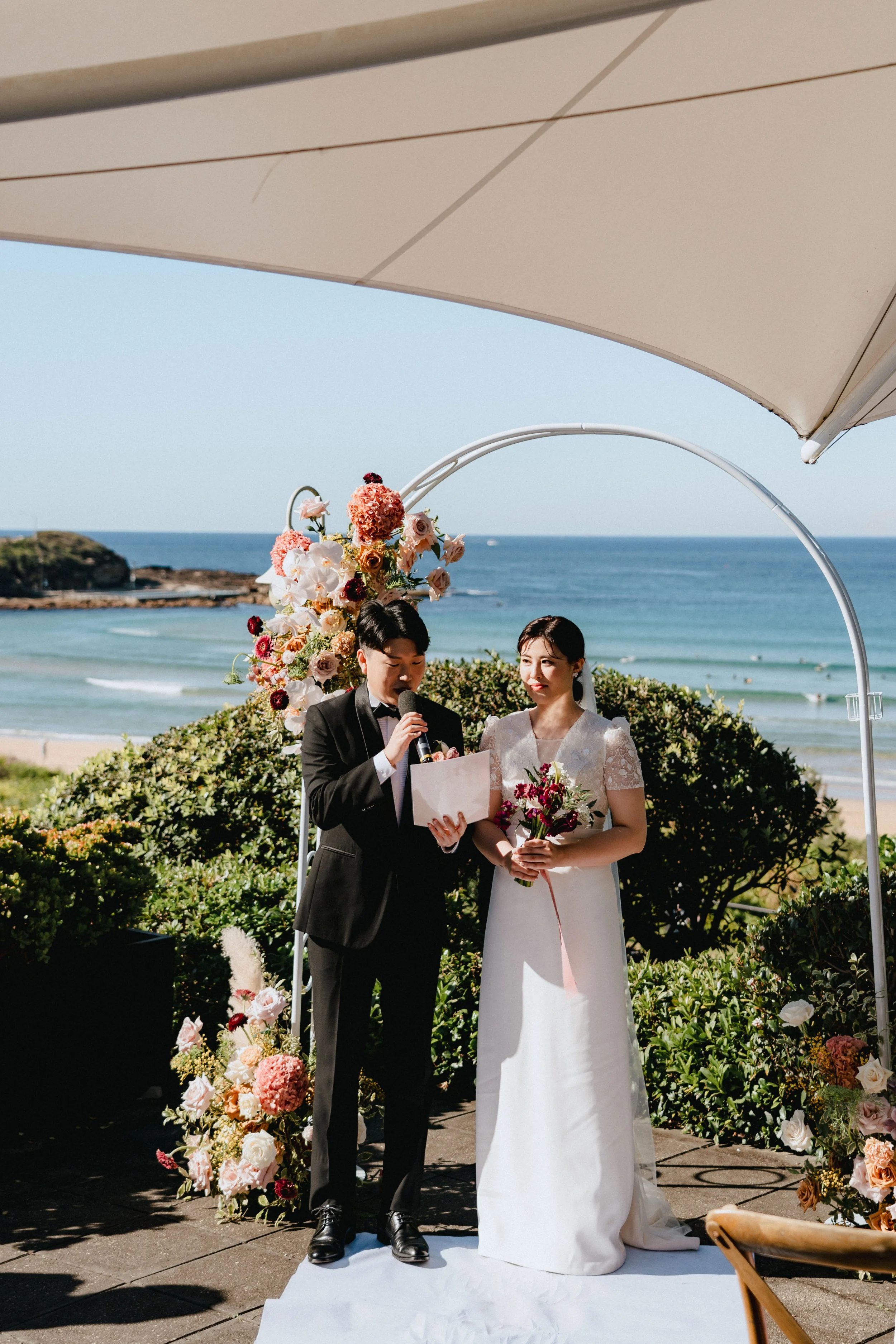 A couple getting married outdoors on a beach with an ocean view, standing under a floral arch with pink and white flowers, with a groom reading vows and a bride holding a bouquet, in daylight.
