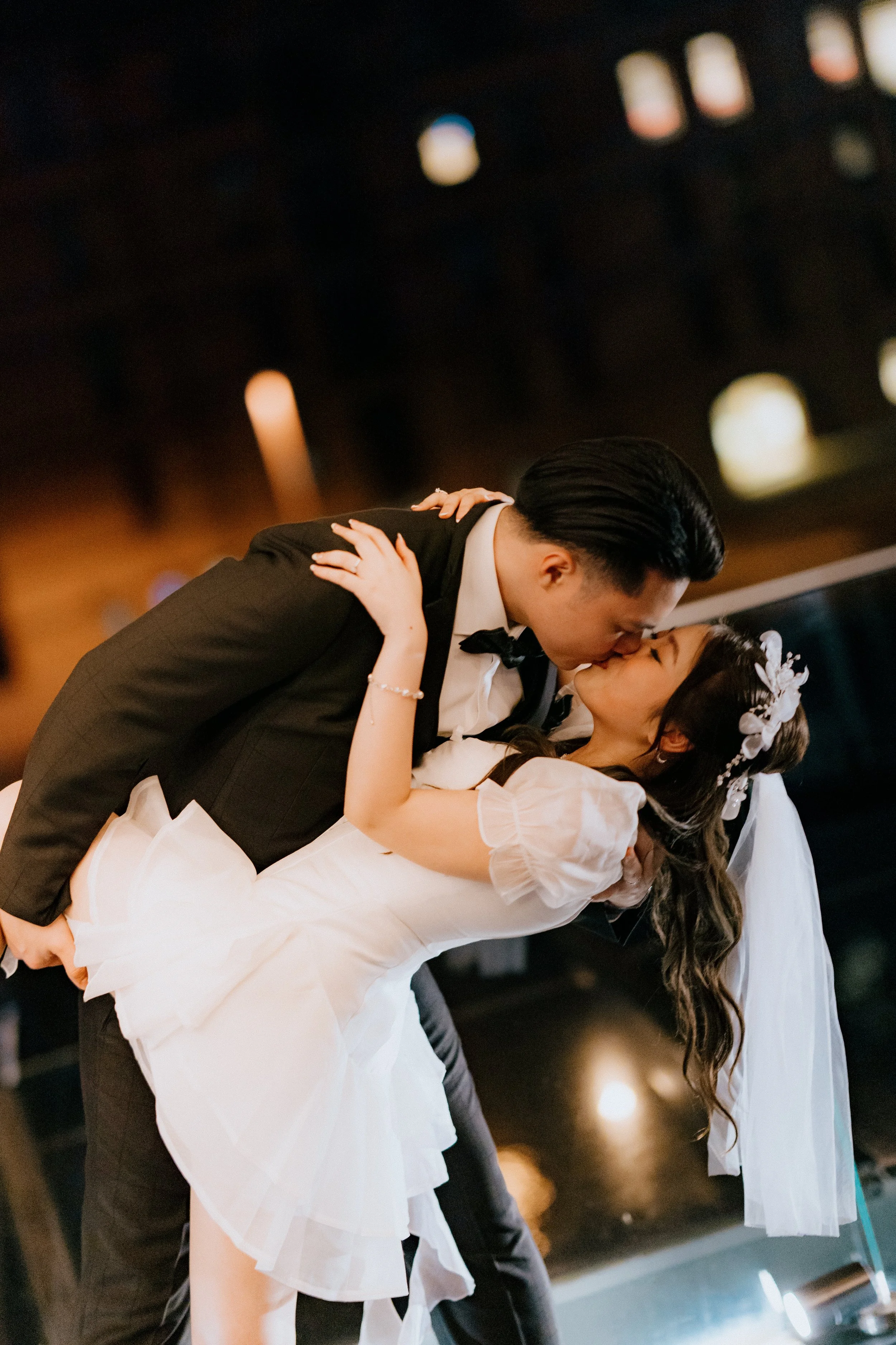A bride and groom share a kiss during their wedding reception, with the groom dipping the bride, who is wearing a white dress with puffy sleeves and a floral headband, while the groom is dressed in a black tuxedo with a bow tie.