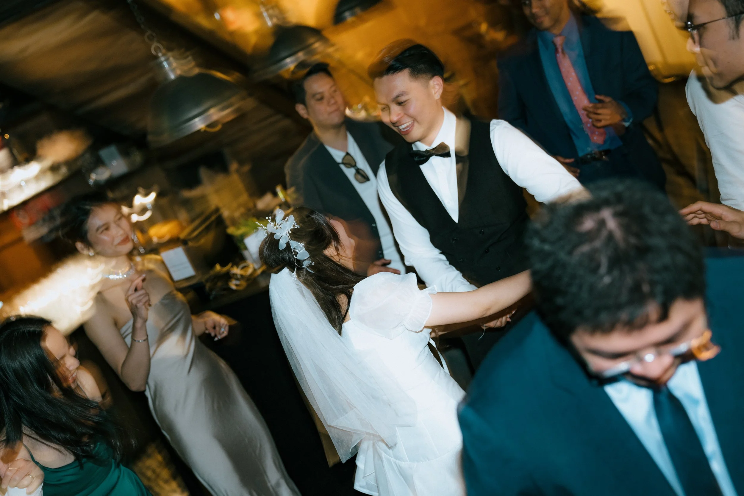 Couple dancing at a wedding reception with friends in a warmly lit indoor setting.