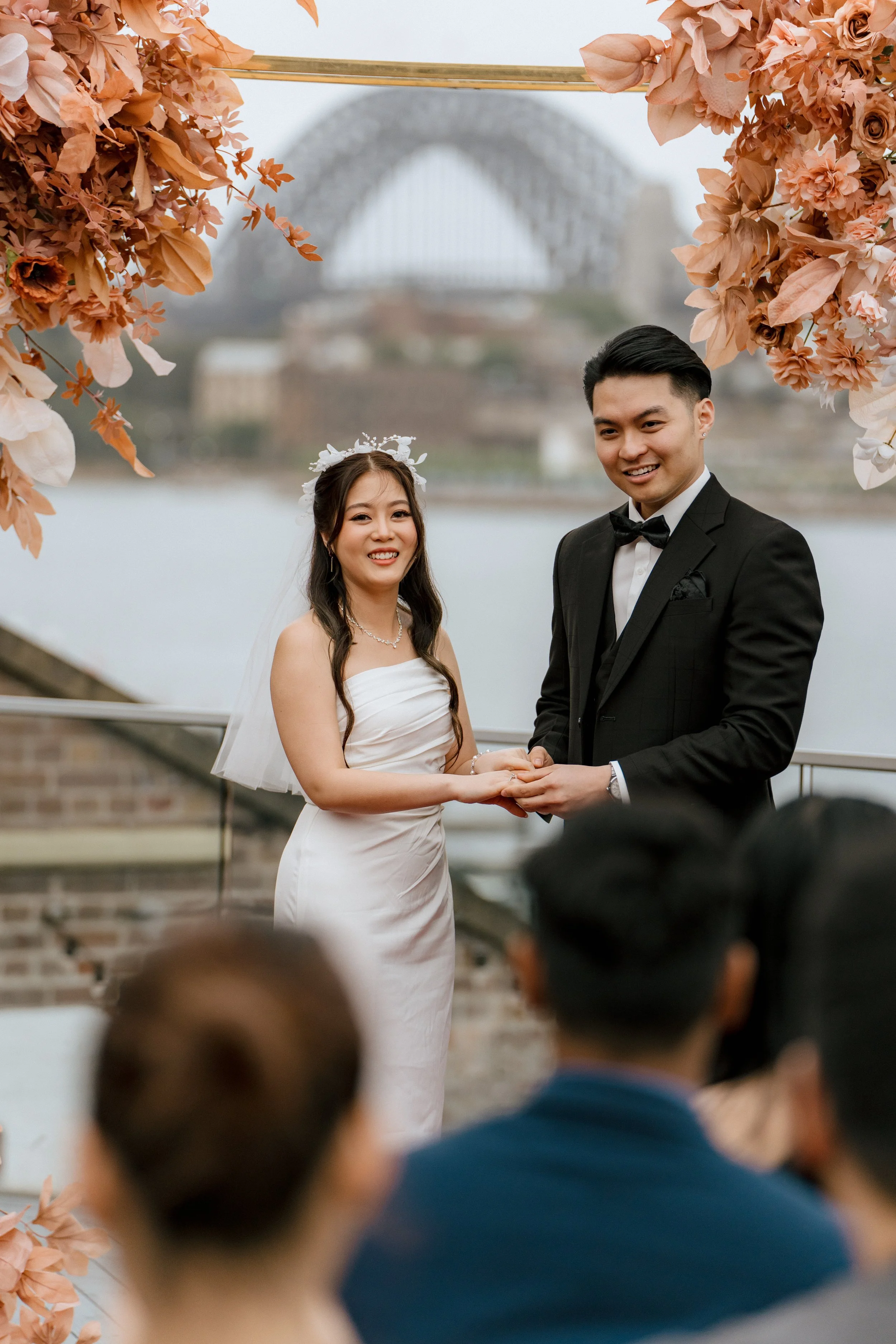 A bride and groom holding hands during their wedding ceremony outdoors on a deck, with the Sydney Harbour Bridge in the background. The bride is wearing a white dress with a veil and floral headpiece, and the groom is dressed in a black tuxedo with a